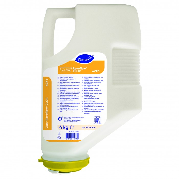Clax Revoflow Clor este un înălbitor pudră foarte concentrat, pe bază de clor. Acest produs este ideal pentru obţinerea unor performanţe foarte mari de înălbire la temperaturi scăzute şi medii. Produsul este conceput pentru a fi folosit alături de alte produse din gama Clax Revoflow, în special atunci când sunt probleme cu performanţa de înălbire, sau atunci când se foloseşte Clax Revoflow Pro Micro, care nu conţine agent de albire.