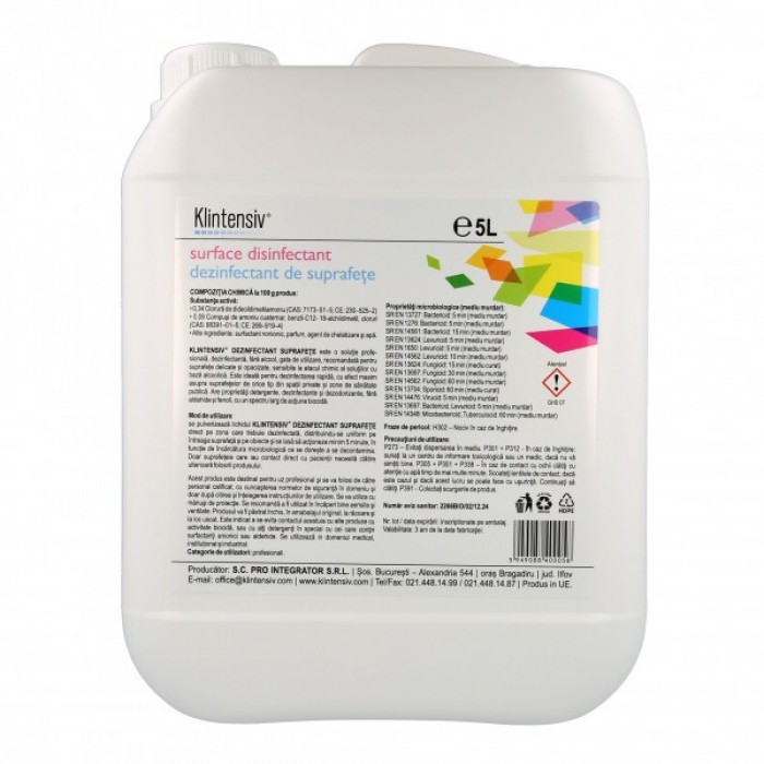 Mod de Utilizare <p><b>Mod de utilizare:&nbsp;</b>&nbsp;se pulverizeaza lichidul&nbsp;<b>KLINTENSIV DEZINFECTANT SUPRAFETE&nbsp;</b>direct pe zona care trebuie dezinfectata, distribuindu-se uniform pe intreaga suprafata si pe obiecte, apoi se lasa sa actioneze 5 minute, in functie de incarcatura microbiologica ce se doreste a se decontamina. Doar suprafetele care iau contact direct cu pacientii necesita clatire ulterioara folosirii produsului.</p><p>Acest produs este destinat pentru uz profesional si se va folosi de catre personal calificat, cu cunoasterea normelor de siguranta in domeniu si doar dupa citirea si intelegerea instructiunilor de utilizare. Se va utiliza cu manusi de protectie. Se recomanda a fi utilizat in incaperi bine aerisite si ventilate. Produsul va fi pastrat inchis, in ambalajul original, la racoare si la loc uscat. Este indicat a se evita contactul acestuia cu alte produse cu activitate biocida, sau cu alti detergenti in special cu cei care contin surfactanti anionici sau aldehide. Se utilizeaza in domeniul medical, institutional si industrial.</p><p><b>Categorie de utilizatori:&nbsp;</b>profesionali</p>